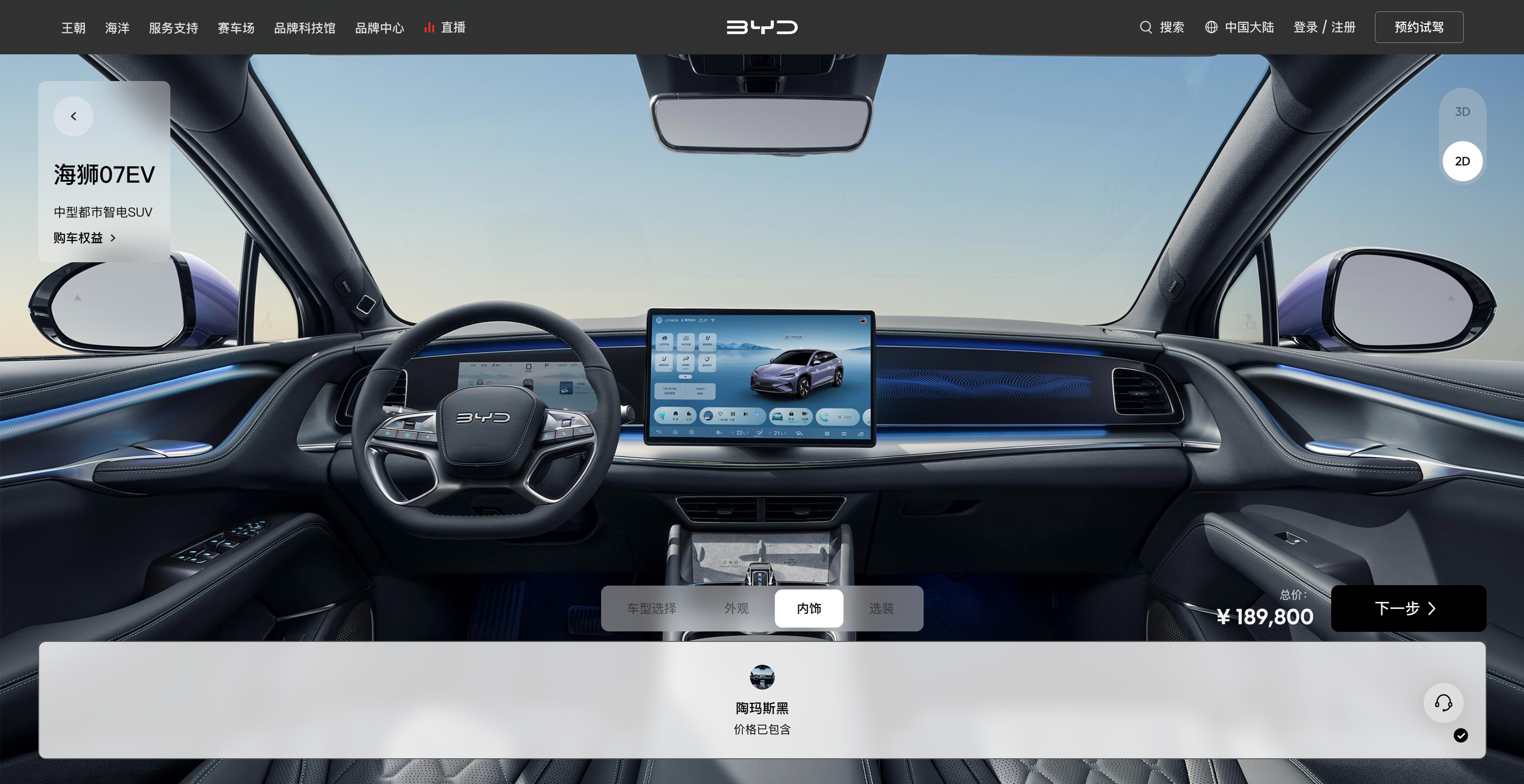 可通过选配页面对车型、外观、内饰、选装进行选配及查询。